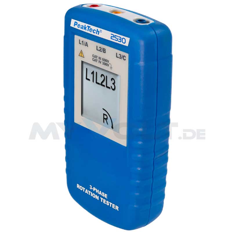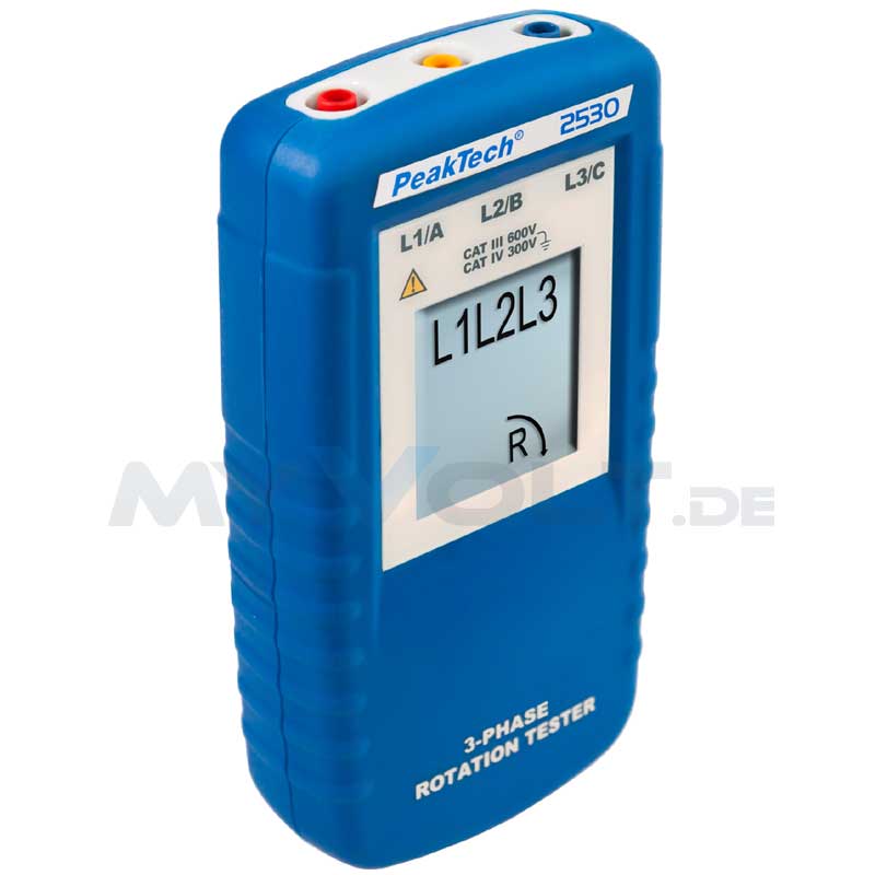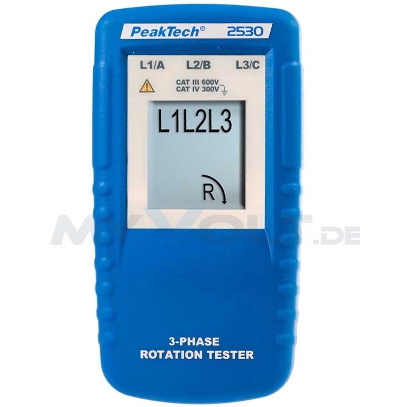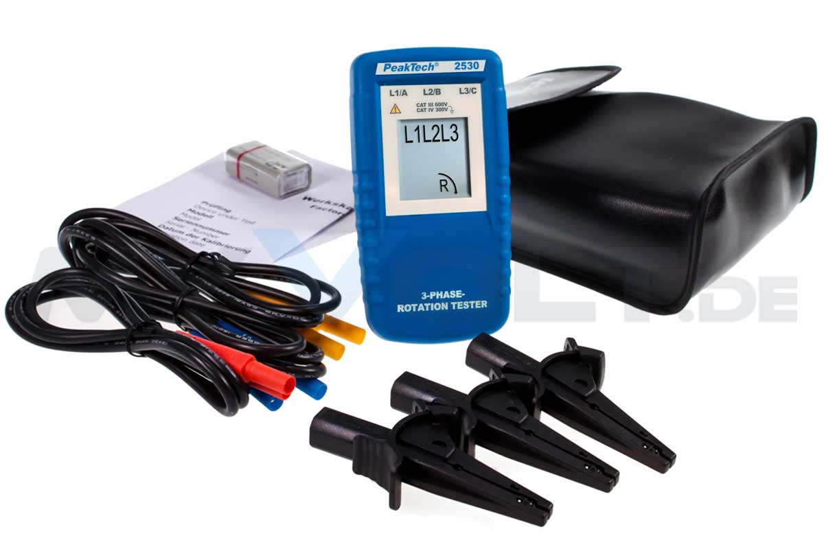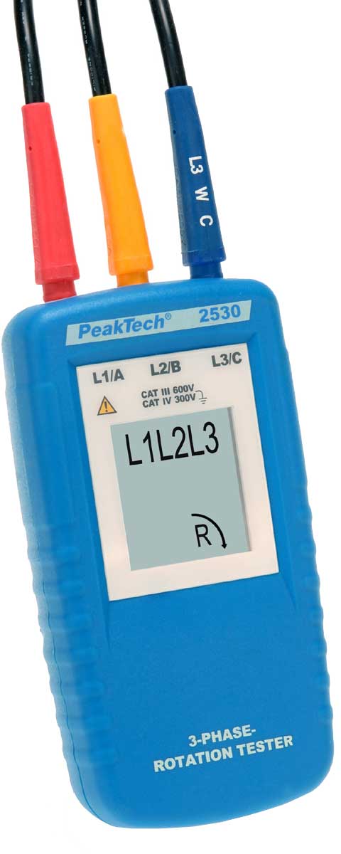 Dieses neue handliche Testgerät PeakTech P-2530, entwickelt nach Sicherheitsstandard CAT III 600 V, im modernen, robustem Design, wurde zur Anzeige der vorhandenen Phasen bzw. von fehlenden Phasen und der Drehrichtung entwickelt. Die Anzeige erfolgt über ein gut ablesbares LC-Display.