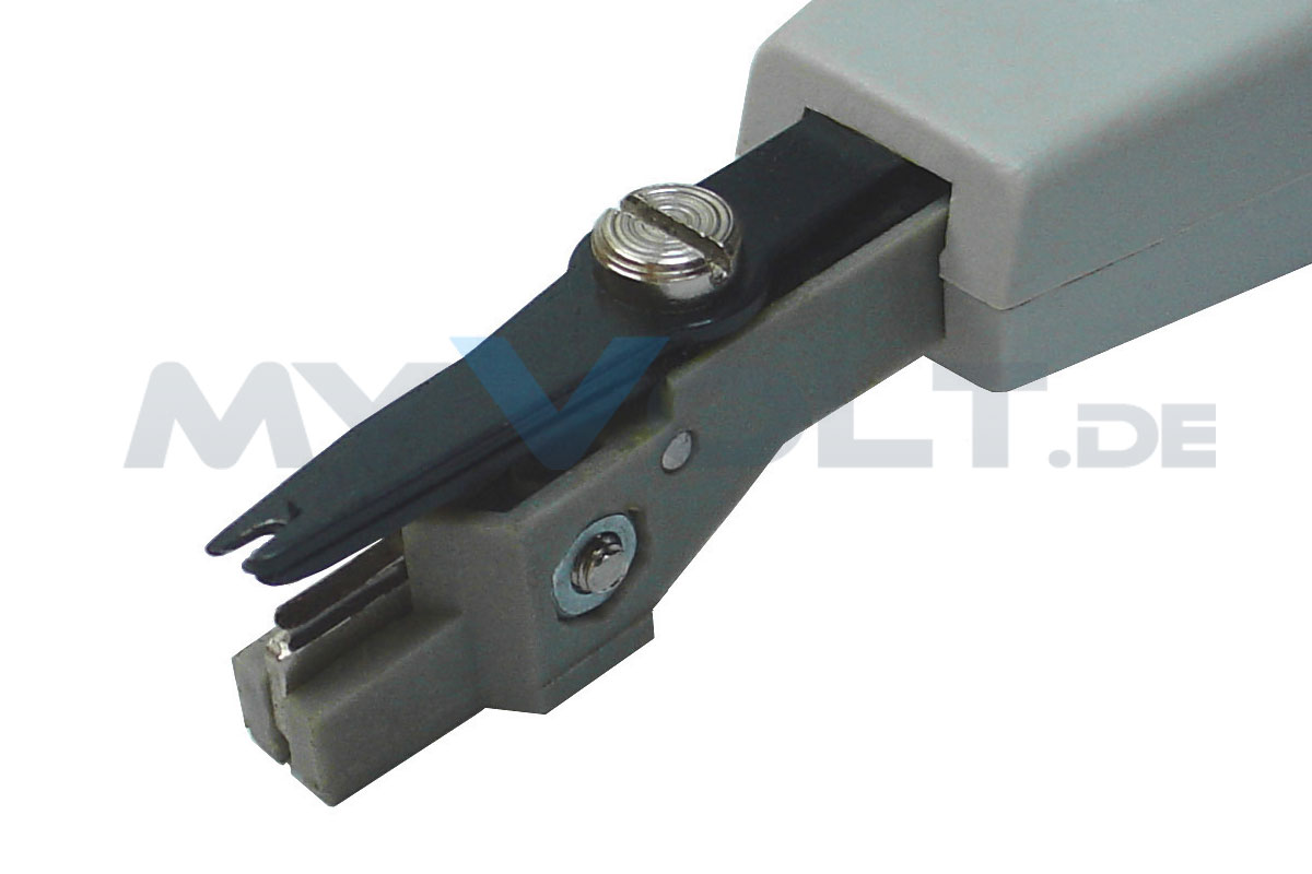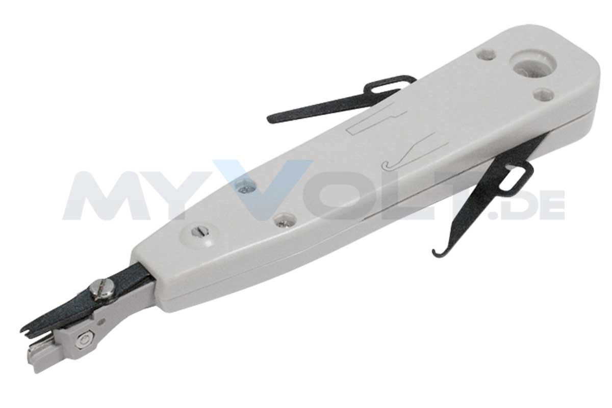 Professionelles Anlegewerkzeug zum anschließen von Telefon-, Netzwerk-, und Verteilerdosen sowie Patchpanels mit LSA Anschluss. In einem Arbeitsgang wird das Kabel kontaktsicher angelegt und der überstehende Kabelrest abgeschnitten. In den Längsseiten des Gerätes sind Abzugshaken (zum lösen der Verbindung) und Universalwerkzeug integriert.