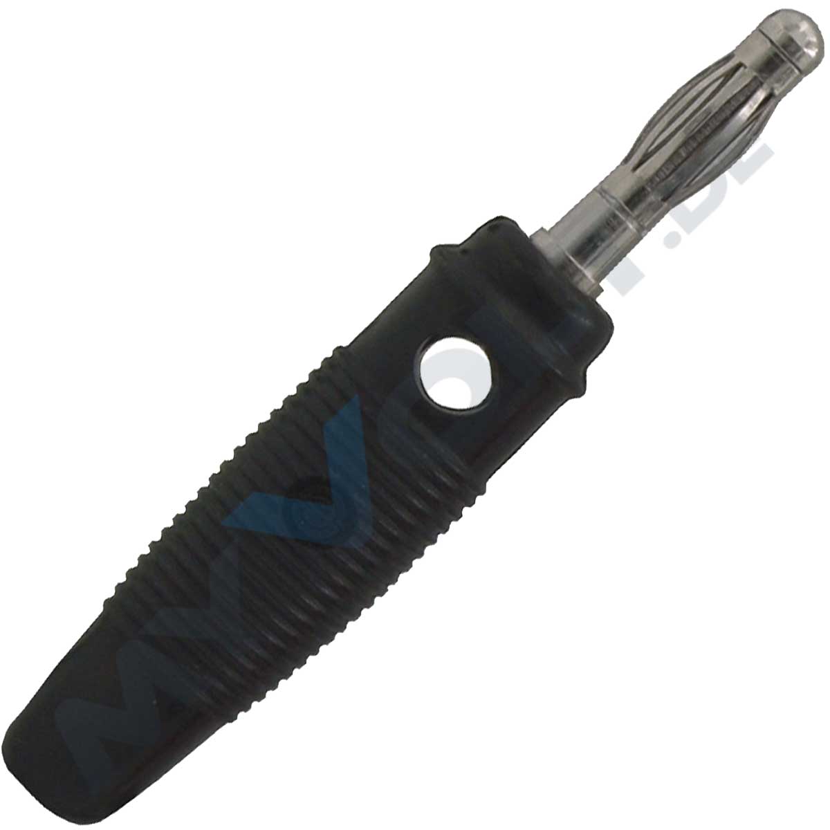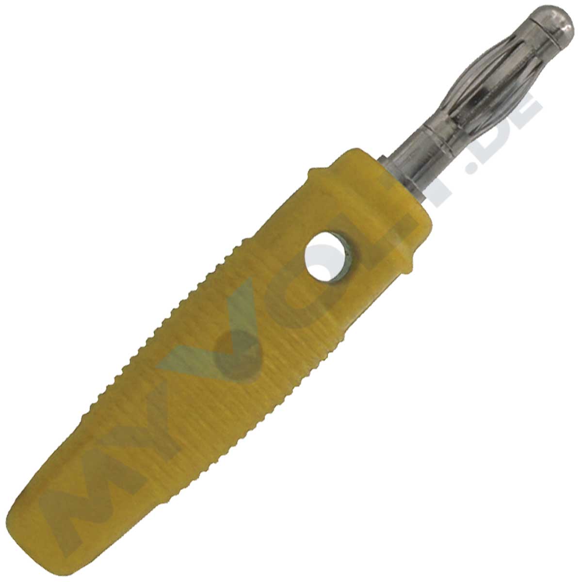 Bananenstecker (4mm Federkorbstecker) mit Isolierhülse in rot oder schwarz. Der Stecker hat ein 4mm Querloch zum einstecken eines weiteren Bananensteckers. Der Anschluss erfolgt über einen Schraubanschluss.