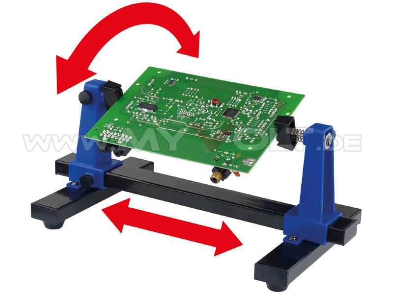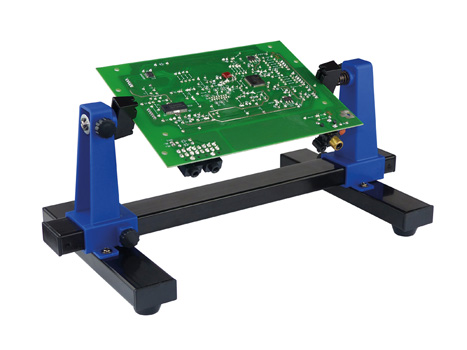 Stabiler Bestückungsrahmen mit einer maximalen Aufspannfläche von 140x 190mm. Die eingespannte Leiterplatte ist um 360° drehbar und kann über 2 Stellschrauben stufenlos fixiert werden. Die montierten Gummifüße sorgen für einen rutschfesten Stand.