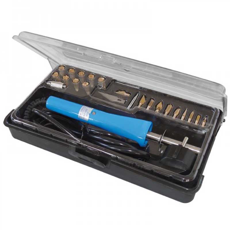 Elektro-Brennstempel-Set mit 30 Watt Lötkolben und einer vielzahl von Schraubaufsätzen. Die Lieferung besteht aus einem Handheizkörper (Lötkolben / Brennstempel), einem Adapter zur Aufnahme eines Messers, ein Messer, eine Lötspitze, 9 Musterstempel und 10 weitere Formaufsätze. Mit der praktischen Aufbewahrungsbox haben Sie alle Teile ordentlich sortiert im Überblick.