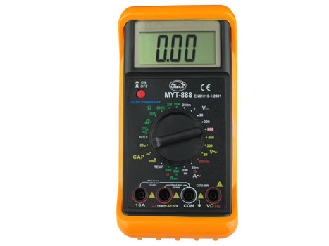 Das Digitalmultimeter MYT-888 mit großem Display bietet dem Profi bei ausgezeichnetem Preis-/Leistungsverhältnis genauste Messfunktionen. Zu den Grundfunktionen gehören Gleich- und Wechselspannungsmessung sowie Gleichstrom, Wechselstrom und Wiederstandsmessung. Weitere Features sind ein Diodentester, ein Transistortester, Temperatur-, Kapazität- und Frequenzmessung sowie ein akustischer Durchgangsprüfer. Alle Messfunktionen sind mit dem zentralen 30-stufigen Drehschalter schnell und einfach auszuwählen. Aufgrund des großen Displays sind die Messwerte stets gut abzulesen. Die Lieferung erfolgt inklusive Prüfleitungen und Batterie.