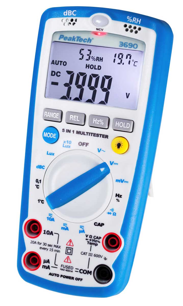 Das Digital-Multimeter PeakTech P-3690 verfügt über eine große, zwei zeilige LCD-Anzeige mit Hintergrundbeleuchtung. Das 5-in-1 Multimeter PeakTech P3690 wurde entwickelt, um die Funktionen Schallpegel-, Lux-, Luftfeuchtigkeits- und Temperaturmessung sowie ein digitales Multimeter zu vereinen.