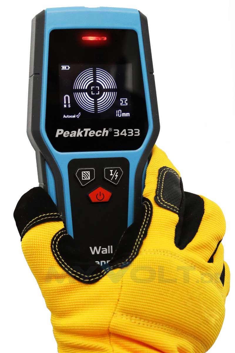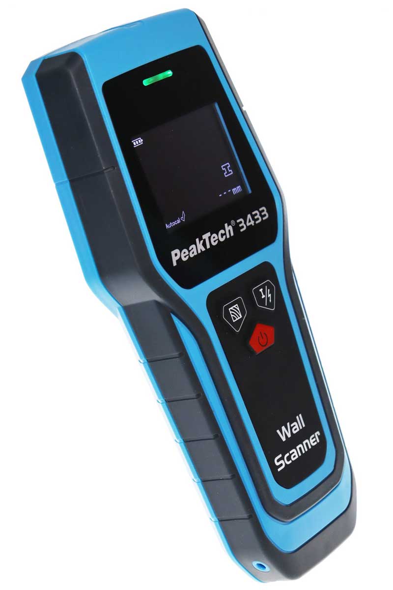 Der Wandscanner PeakTech P-3433 wurde speziell für den täglichen Gebrauch im Handwerk entwickelt, da er zur Vorbereitung von Arbeiten wie zum Beispiel die Durchführung von Schlitz- und Stemmarbeiten oder Bohrungen in Wänden, Böden oder Decken genutzt werden kann. Das Material Ortungssuchgerät ist in der Lage Materialien wie Metall, Holzbalken und spannungsführende Leitungen in Wänden zu detektieren. Das invertierte LC-Display stellt den Abstand zum gefundenen Material visuell dar und hilft dem Anwender die interne Beschaffenheit der Wand einzuschätzen, bevor es z.B. zu Beschädigungen von Rohren oder Kurzschlüssen in Stromleitungen kommt. Die Empfangstiefe des Sensors liegt je nach gesuchtem Material zwischen 20mm (Holz) und 120mm (Eisenhaltiges Metall). Zudem zeigt eine LED (grün, gelb, rot) an, ob ein Material gefunden wurde oder ob eine spannungsführende Leitung an der aktuellen Prüfstelle vorhanden ist. Die einfache Bedienung, sichere Anwendung und hochwertige Verarbeitung machen dieses Modell zum unverzichtbaren Begleiter eines jeden Handwerkers, Heimwerkers oder Installateurs bei der Instandhaltung und bei sämtlichen Arbeiten im Gebäudesektor.