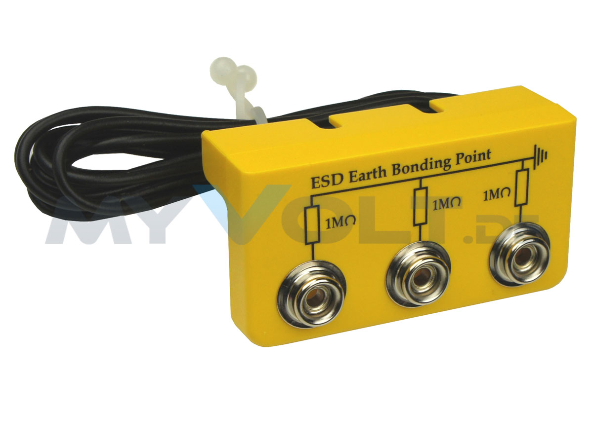 ESD-Erdungsbox mit 3x 10,3 mm Druckknopfanschlüssen. Der Anschluss erfolgt über ein 2,0 m langes Kabel mit Schrauböse.
