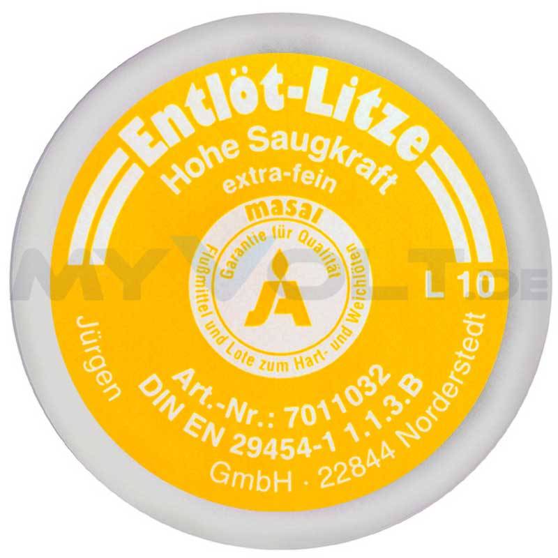 zur sauberen und schonenden Aufnahme von Lötzinn bei Entlötarbeiten. Diese Entlöt-Litze zeichnet sich durch eine hohe Saugkraft aus und ist mit NO-Clean Flussmittel getränkt. Die Entlöt-Litze ist in folgenden Breiten erhältlich und wird in einer praktischen Spenderbox geliefert.L05 0,5mm breit (SMD) orange ESD 0,8mm breit (SMD) Antistatikspule weißL10 1,0mm breit (extra-fein) gelb L15 1,5mm breit (fein) grün ESD 1,5mm breit (fein) Antistatikspule gelbL20 2,0mm breit (mittel) rot ESD 2,2mm breit (mittel) Antistatikspule grünL25 2,5mm breit (grob) blauESD 2,7mm breit (grob) Antistatikspule blau