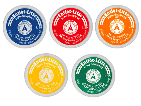 zur sauberen und schonenden Aufnahme von Lötzinn bei Entlötarbeiten. Diese Entlöt-Litze zeichnet sich durch eine hohe Saugkraft aus und ist mit NO-Clean Flussmittel getränkt. Die Entlöt-Litze ist in folgenden Breiten erhältlich und wird in einer praktischen Spenderbox geliefert.L05 0,5mm breit (SMD) orange ESD 0,8mm breit (SMD) Antistatikspule weißL10 1,0mm breit (extra-fein) gelb L15 1,5mm breit (fein) grün ESD 1,5mm breit (fein) Antistatikspule gelbL20 2,0mm breit (mittel) rot ESD 2,2mm breit (mittel) Antistatikspule grünL25 2,5mm breit (grob) blauESD 2,7mm breit (grob) Antistatikspule blau