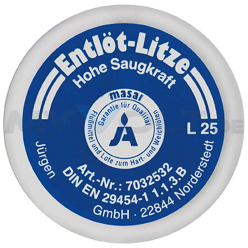 zur sauberen und schonenden Aufnahme von Lötzinn bei Entlötarbeiten. Diese Entlöt-Litze zeichnet sich durch eine hohe Saugkraft aus und ist mit NO-Clean Flussmittel getränkt. Die Entlöt-Litze ist in folgenden Breiten erhältlich und wird in einer praktischen Spenderbox geliefert.L05 0,5mm breit (SMD) orange ESD 0,8mm breit (SMD) Antistatikspule weißL10 1,0mm breit (extra-fein) gelb L15 1,5mm breit (fein) grün ESD 1,5mm breit (fein) Antistatikspule gelbL20 2,0mm breit (mittel) rot ESD 2,2mm breit (mittel) Antistatikspule grünL25 2,5mm breit (grob) blauESD 2,7mm breit (grob) Antistatikspule blau