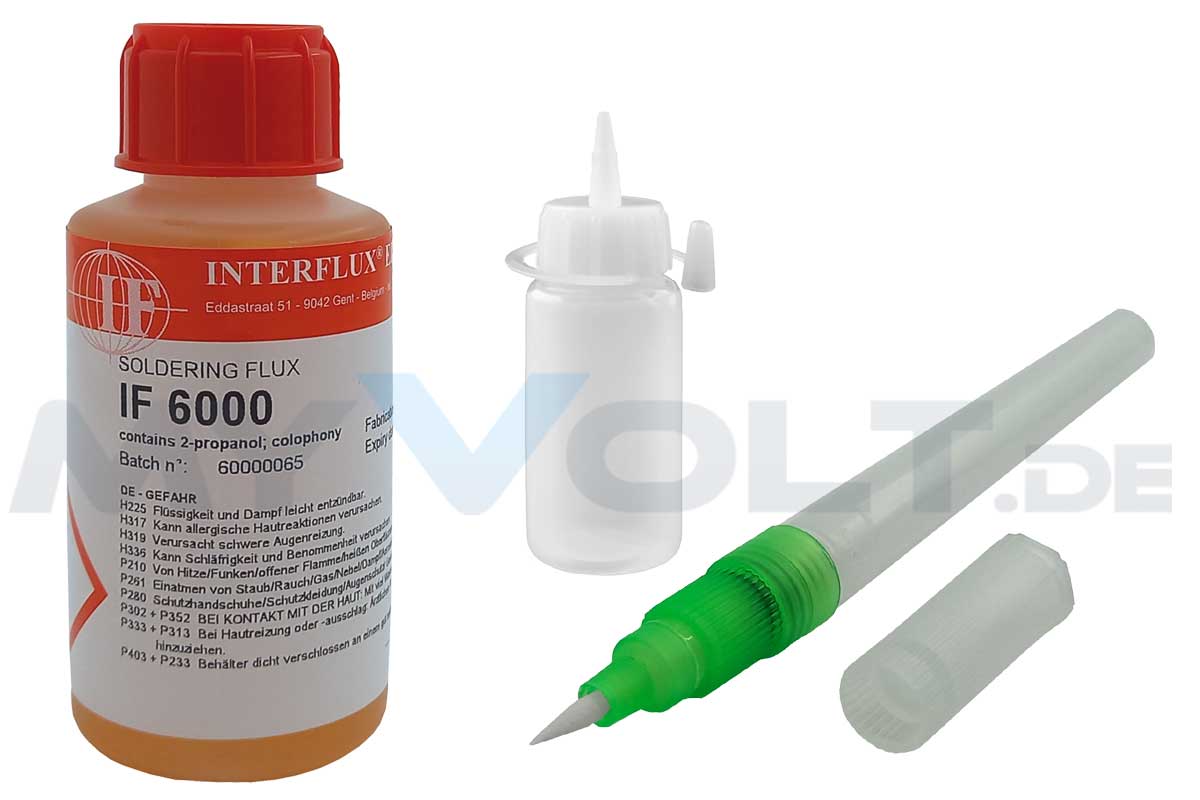 Interflux IF 6000 ist ein no-clean Flussmittel, dass für einen selektiven Flussmittelauftrag entwickelt wurde. Typische Einsatzgebiete sind Handlöten, Nacharbeit, automatisches Löten, BGA-Reparatur und Bügellöten.Wegen des großen Einsatzgebietes gibt es verschiedene Möglichkeiten der Verarbeitung. Das Flussmittel  kann mittels Pinsel, sprühen oder tauchen aufgetragen werden und ist kompatibel mit bleifreien und bleihaltigen Legierungen.IF 6000 enthält ein natürliches Kolophonium. Abhängig von der eingesetzten Menge und dem Temperaturprofil kann das Flussmittel nach dem Löten leichte Rückstände hinterlassen.