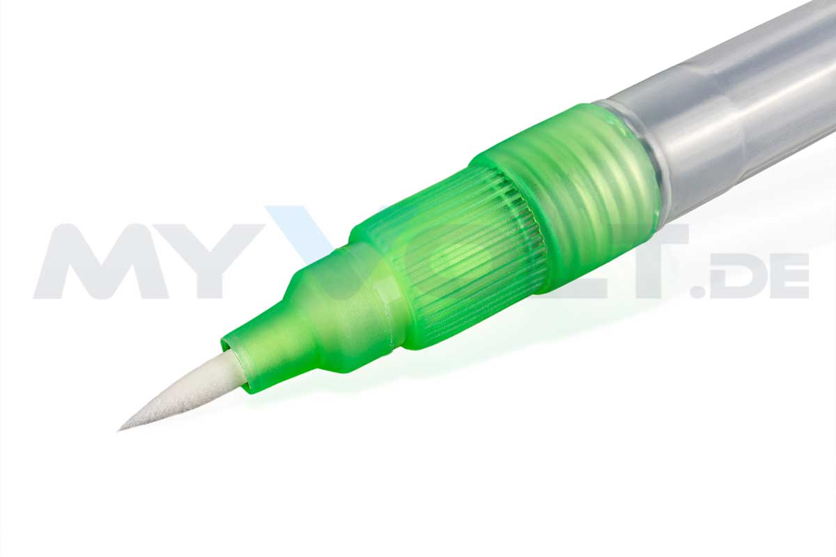 Befüllbarer / nachfüllbarer Flussmittelstift / Dosierstift mit 10 ml Vorratsbehälter. Durch kurzzeitiges Aufdrücken der Faserspitze auf die zu bearbeitende Oberfläche öffnet sich die Verschlussmechanik. Die Faserspitze kann sich während dessen mit der Flüssigkeit aus dem Vorratsbehälter vollsaugen. Anschließend kann die eingefüllte Flüssigkeit wie mit einem Faserstift aufgetragen werden.