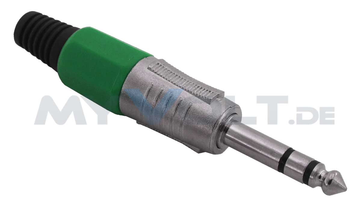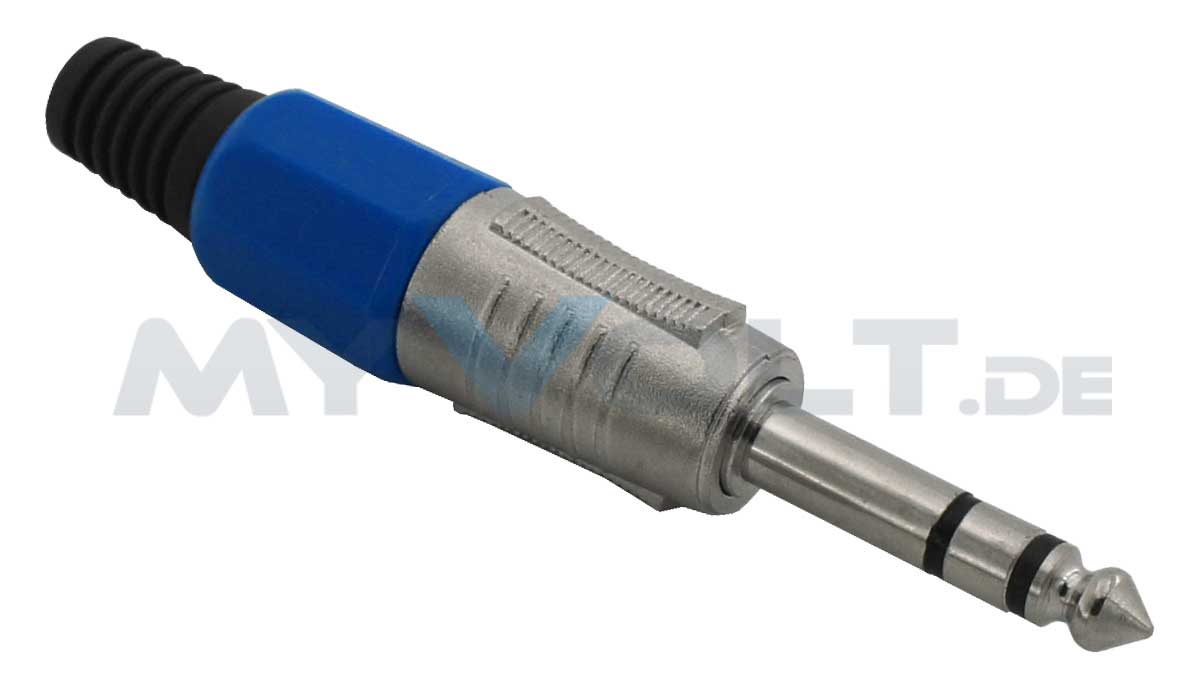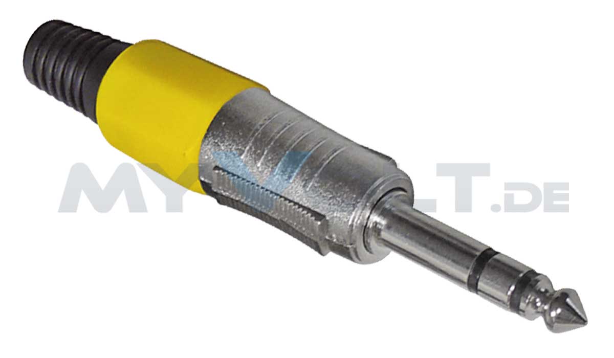 Professioneller Klinkenstecker 6,3 mm Stereo in blau, rot, grün, gelb oder schwarz erhältlich. Der Stecker besitzt eine stabile Metallgriffhülse und ist mit Knickschutz und robuster Zugentlastung ausgestattet.