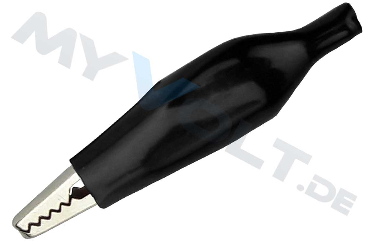 Krokodilklemme mit weicher PVC Isolierung. Der Anschluss erfolgt über eine Löt-und Quetschverbindung