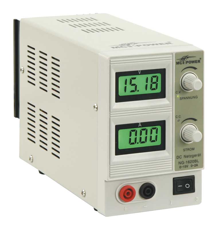 Das Modell NG-1620 BL ist ein hochpräzises, gleichspannungsgeregeltes Netzgerät für Werkstatt, Hobby und Labor. Die Ausgangsspannung ist stufenlos von 0-15V einstellbar. Auch die Stromstärke lässt sich in einem Bereich von 0-2 A stufenlos begrenzen. Die beiden hintergrundbeleuchteten LCD-Anzeigen geben permanent Auskunft über die anliegende Spannung und die aktuelle Stromstärke. Für die Spannungs- und Stromregulierung stehen jeweils 1 Regler zur Verfügung. Zwei 4mm Laborbuchsen (+,- ) bilden ein robustes Anschlussterminal.