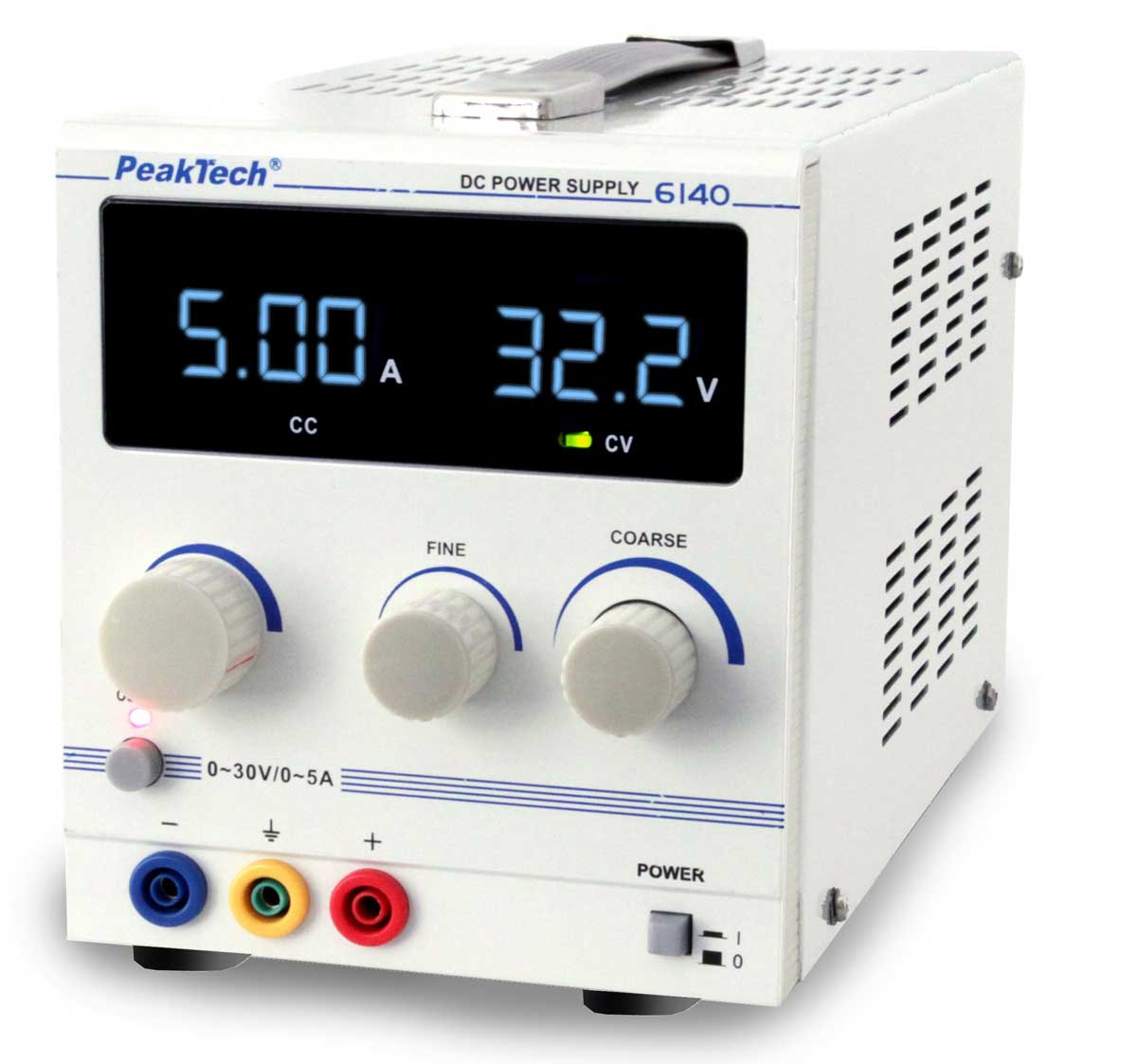 Das PeakTech P-6140 ist ein völlig neu konzipiertes, linear geregeltes Labornetzgerät in modernem Design - ausgestattet mit neuester Technologie. Die zwei 3-stelligen 14 mm blauen LED-Anzeigen ermöglichen eine schnelle und präzise Ablesung von Spannungs- und Stromwerten. Die Ausgangsspannung kann stufenlos zwischen 0-30V eingestellt werden. Im Konstantstrom-Modus ist der Ausgangsstrom ( 0-5A ) ebenfalls stufenlos einstellbar.