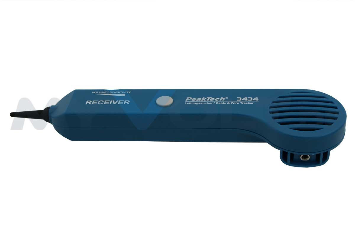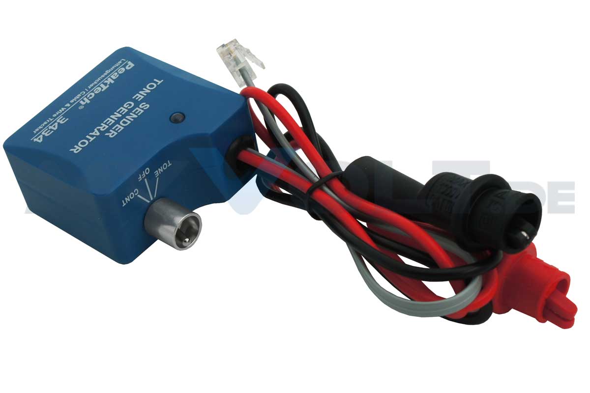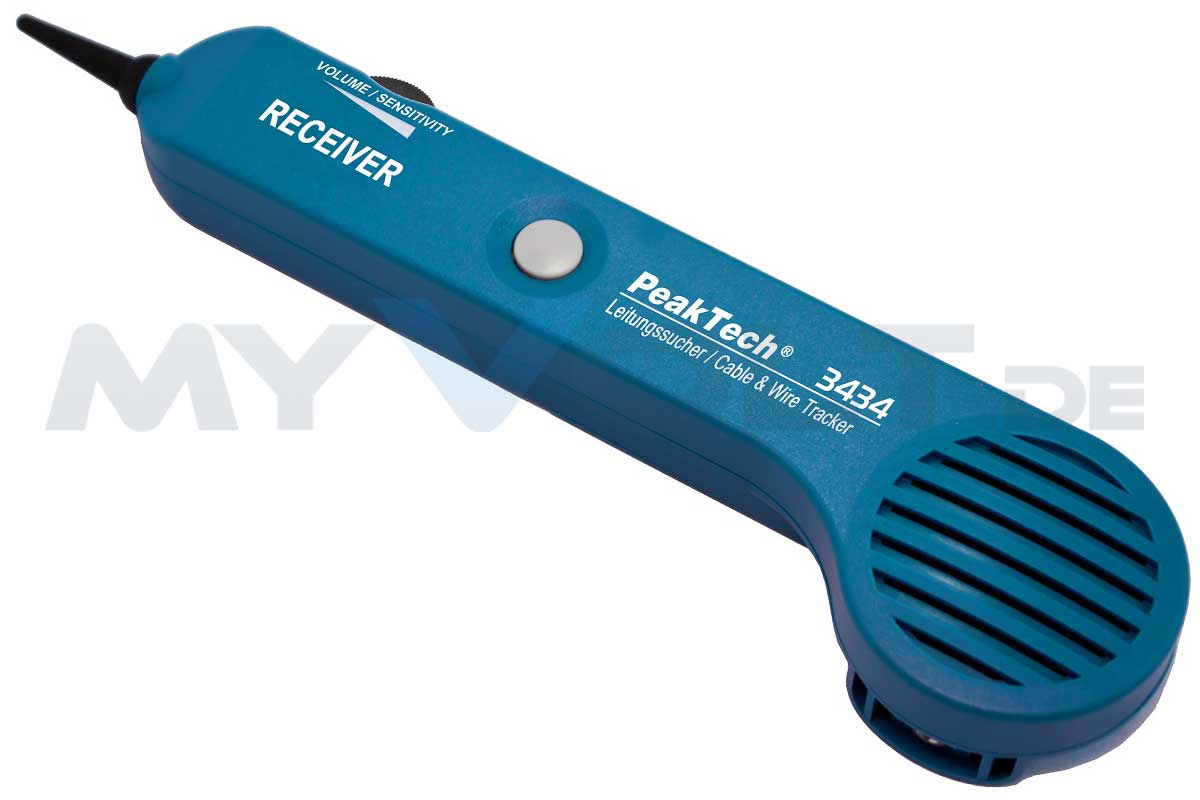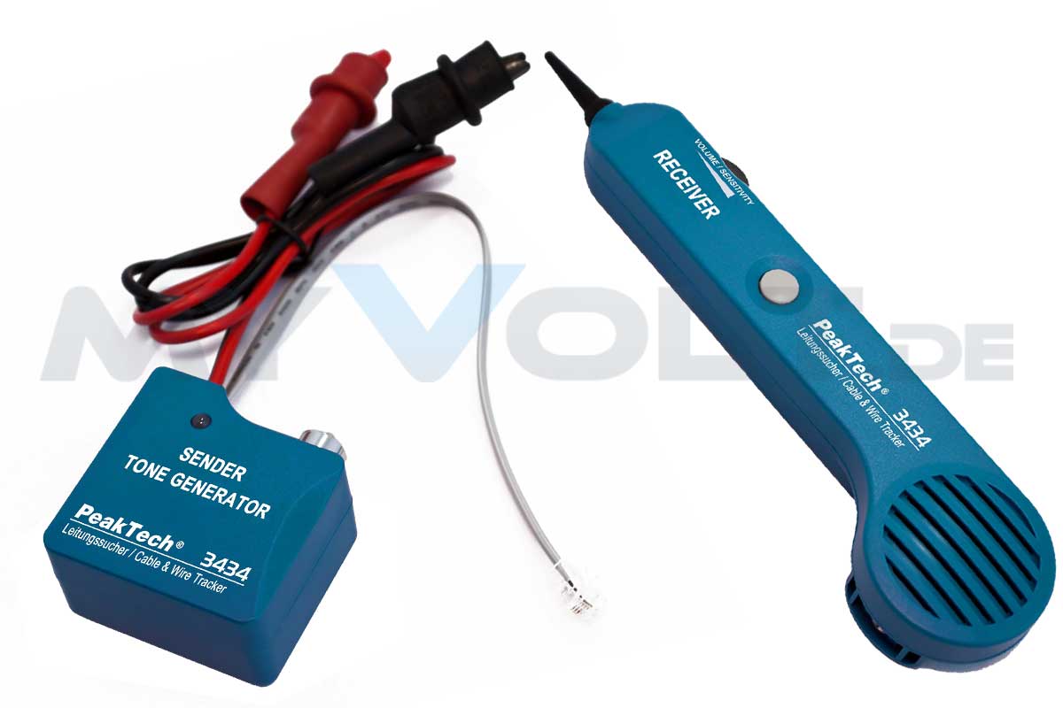 Der Leitungssucher PeakTech P-3434 ist ein professionelles Suchgerät zur kontaktlosen Verfolgung und Identifikation von Leitungen und Kabeln sowie zum Testen von analogen Telefonleitungen. Er arbeitet akustisch und bietet eine schnelle und preiswerte Lösung um spannungsfreie Leitungen in einer Hausinstallation aufzuspüren. Das zweiteilige Leitungssuchgerät besteht aus einem Sender (Tongenerator 1 kHz), welcher ein Trägersignal auf die zu identifizierende Leitung moduliert und einem hochempfindlichen induktiven Empfänger. Die Signalisierung erfolgt über den integrierten Lautsprecher oder einem an der Kopfhörerbuchse angeschlossenen Kopfhörer, der den eingespeisten Signalton akustisch wiedergibt. Die Empfindlichkeit ist über ein Drehpotentiometer einstellbar, so dass eine sehr exakte Identifikation und Verfolgung auch in dicken Leitungsbündeln zuverlässig möglich ist. Beim Anschluss an einer analogen Telefonleitung gibt die LED des Senders den Zustand der aktiven Telefonleitung zwischen "frei", "besetzt" oder "klingelnd" an. Zudem verfügt der Sender über einen Durchgangsprüfer, welcher in Abhängigkeit vom Leitungswiderstand die LED bei geringen Widerstand und Durchgang (hell) und bei Erhöhung des Widerstandes entsprechend abgeschwächt aufleuchten lässt. Ab einen Widerstand von über 10.000 Ohm erlischt die LED. Das Leitungssuchgerät PeakTech P-3434 wird als komplettes Set mit Sender und Empfänger in einer praktischen Tasche geliefert.