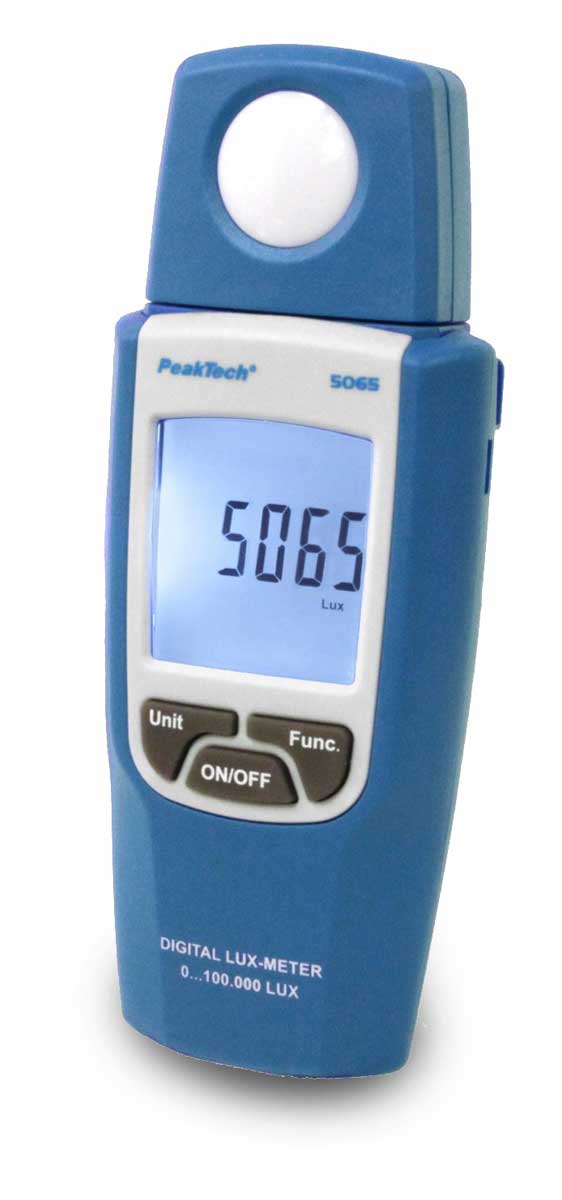 Das digitale Licht-Messgerät (Lux Meter) PeakTech P-5065 ist mit 5 1/2-stelliger 12 mm LCD-Anzeige und Hintergrundbeleuchtung sowie einem 270° schwenkbaren Lichtsensor zur optimalen Lichtmessung auch an schlecht erreichbaren Messobjekten ausgestattet. Die automatische Nullpunktkalibrierung und der Silikon-Fotodioden-Sensor des PeakTech P-5065 zeugen von einem durchdachten Messgerät.