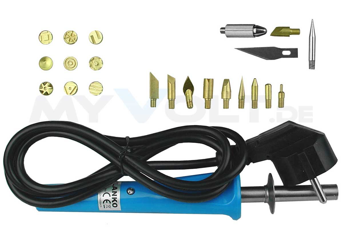 Elektro-Brennstempel-Set mit 30 Watt Lötkolben und einer vielzahl von Schraubaufsätzen. Die Lieferung besteht aus einem Handheizkörper (Lötkolben / Brennstempel), einem Adapter zur Aufnahme eines Messers, ein Messer, eine Lötspitze, 9 Musterstempel und 10 weitere Formaufsätze. Mit der praktischen Aufbewahrungsbox haben Sie alle Teile ordentlich sortiert im Überblick.