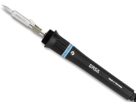 Innenbeheizter Feinlötkolben, ideal für den mobilen Einsatz bei Service-Techniker, mit extrem hitzebeständiger Anschlussleitung. Eine außergewöhnlich große Auswahl an innenbeheizten ERSADUR-Lötspitzen steht zur Verfügung: das heißt, es können neben konventionellen Lötanwendungen selbst SMT-Bauelemente ein- und ausgelötet werden.
