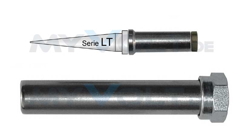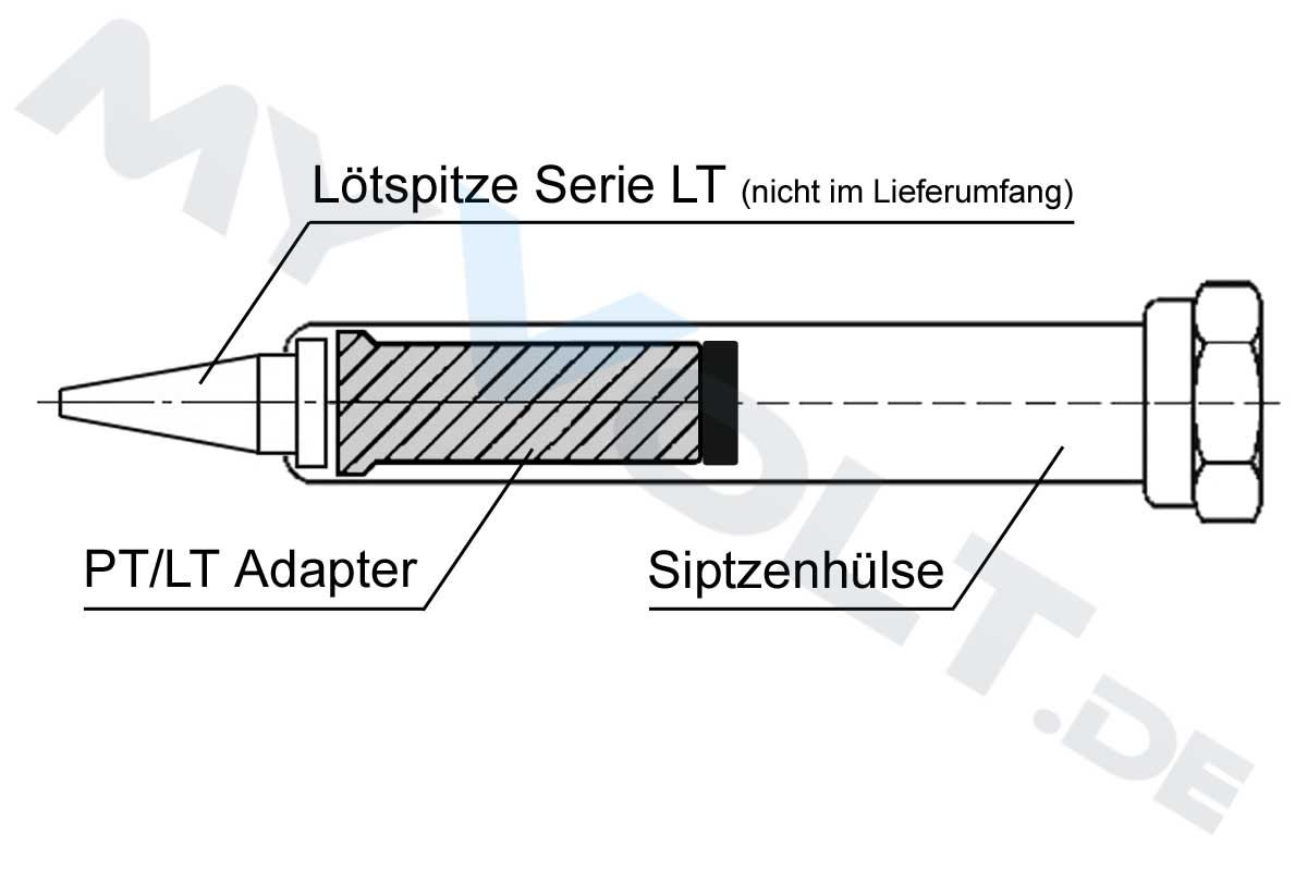 Lötspitzen-Adapter-Set für die Verwendung von LT-Lötspitzen an Stelle von PT-Lötspitzen ( 480°C ). Das Set besteht aus einem Adapter und einer passenden Überwurfhülse mit Mutter.