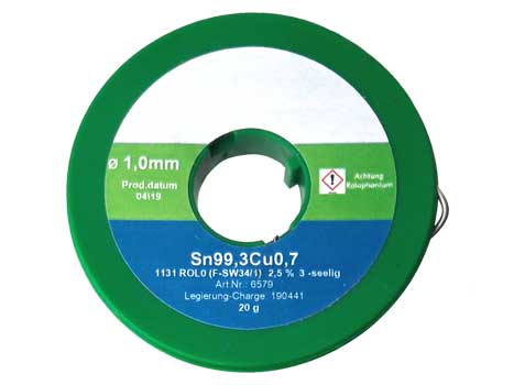Lötzinn / Lötdraht 1,0mm Sn99,3Cu0,7 mit 2,5% Flußmittelgehalt. Der Lötdraht ist als 20g Spule erhältlich