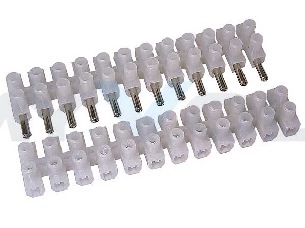 Lüsterklemmen-Paar steckbar mit 12 Klemmen. Die Leisten sind individuell teilbar und können Kabel mit einem Querschnitt von 2,5 mm² oder 4,0 mm² aufnehmen.