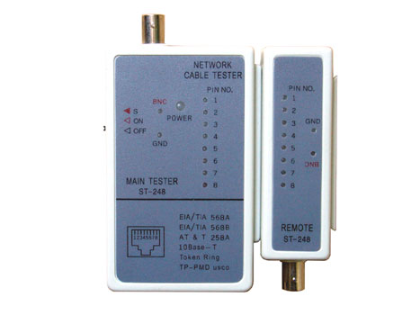 Universeller Tester für Netzwerk- und ISDN-Kabelverbindungen. Sender und Empfänger sind jeweils mit einem RJ45 und einem BNC- Anschluss ausgestattet. Getestet wird der Durchgang und die Belegung. Da sich Sender und Empfänger trennen lassen, ist auch die Prüfung bereits verlegter Kabel möglich. Die Auslieferung erfolgt mit passender Kunstledertasche und Bedienungsanleitung (engl.). Die Stromversorgung erfolgt über eine 9V-Block-Batterie (nicht im Lieferumfang).