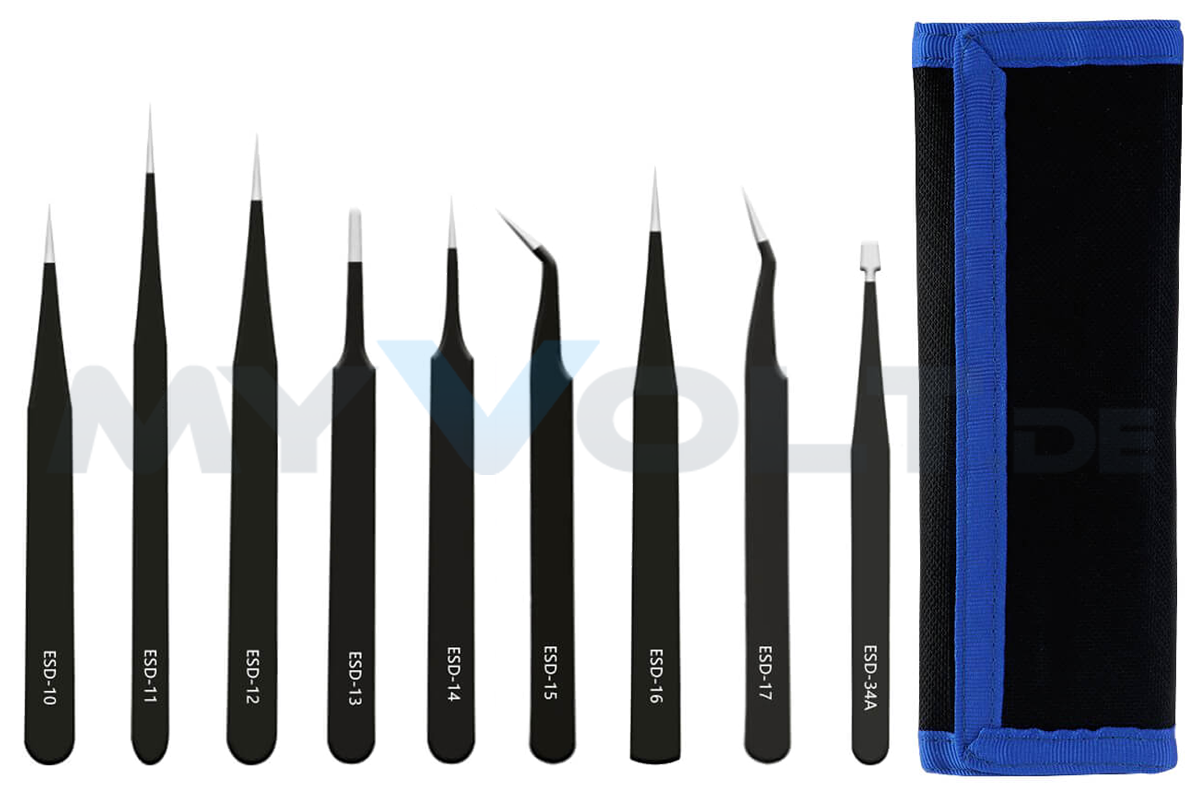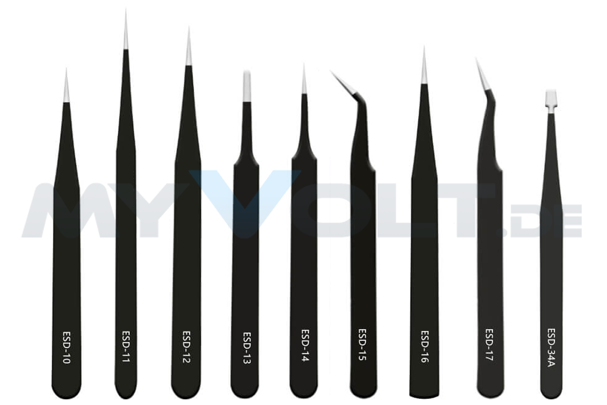 Mit diesem 9-teiligen ESD-Pinzetten-Set sind Sie bestens ausgestattet um präzise Arbeiten auch an empfindlichen elektronischen Komponenten durchführen zu können. Die Pinzetten sind aus beschichtetem Edelstahl gefertigt und besonders langlebig und widerstandsfähig. Im Set erhalten ist eine praktische Aufbewahrungstasche, mit der Sie Ihre Pinzetten sicher aufbewahren und transportieren können. So haben Sie jederzeit alles Griffbereit, wenn Sie es benötigen.