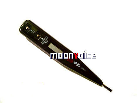 Spannungsprüfer mit integrierter LCD Anzeige. Der Spannungsprüfer zeigt die gemessenen Spannungen in den Schritten 12, 36, 55, 110 und 220 an. Das Gerät ist für Spannungen bis 250 V zugelassen und benötigt keine Batterien. Die Länge des Gerätes beträgt etwa 130 mm.