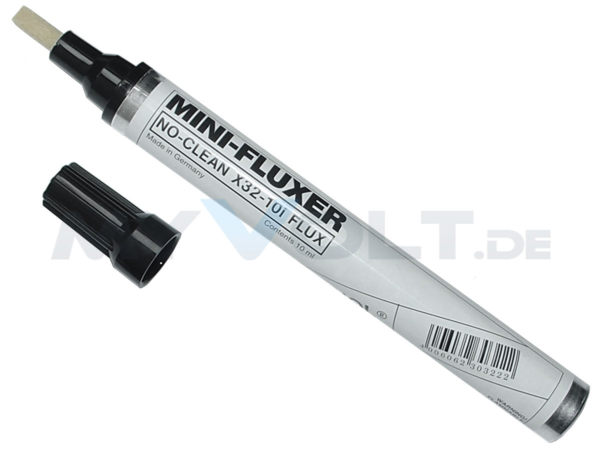Der Stannol Flussmittelstift MINI-FLUXER ( NO CLEAN - X32-10i FLUX PEN ) ist besonders für schnelle Reparaturen an Leiterplatten mit verschmutzten Pads und Bauteilen geeignet. Mit der Ventilfaserspitze (ähnlich einer Filzstiftspitze) kann das Flussmittel gezielt und präzise selbst an schwer zugänglichen Stellen aufgetragen werden. Die geringfügigen Flussmittelrückstände können auf der Leiterplatte verbleiben (NO CLEAN Flussmittel). Stannol-Flussmittelstifte haben an der Spitze einen Federmechanismus aus rostfreiem Material. Durch geringen Druck kann eine kontrollierte Menge Flussmittel auf die zu bearbeitende Oberfläche aufgebracht werden. Dieser präzise Dispensermechanismus verhindert Tropfen, unnötigen Verbrauch und Auslaufen in andere Bereiche der Leiterplatte. Der Stannol Flussmittelstift MINI-FLUXER X32-10i FLUX PEN eignet sich besonders für sensitive Baugruppen, frische oder passivierte Cu-Oberflächen und ist Universell einsetzbar. Ideal für Reparaturen und nachträgliche Montage von SMD-Bauteilen auf dicht bestückten Platinen sowie auf keramischen Substraten.