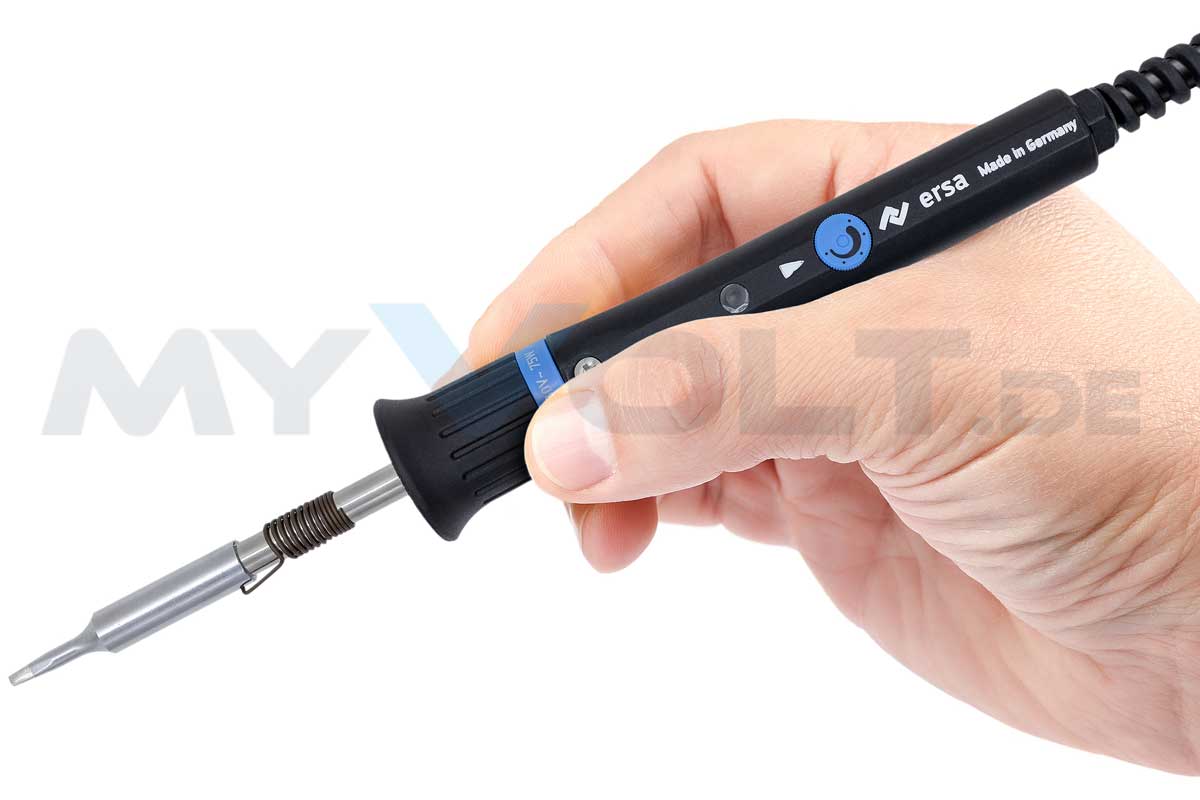 Leistungsstarker, robuster, temperaturgeregelter Lötkolben. Die bewährte ERSA RESISTRONIC Temperaturregelung sorgt in Verbindung mit dem keramischen PTC-Heizelement für schnelles Auf- und Nachheizen. Mit dem ERSA PTC70 / 0710CD / PTC-70 können sowohl feinste Lötarbeiten wie auch Anwendungen mit mittlerem Wärmebedarf professionell ausgeführt werden.