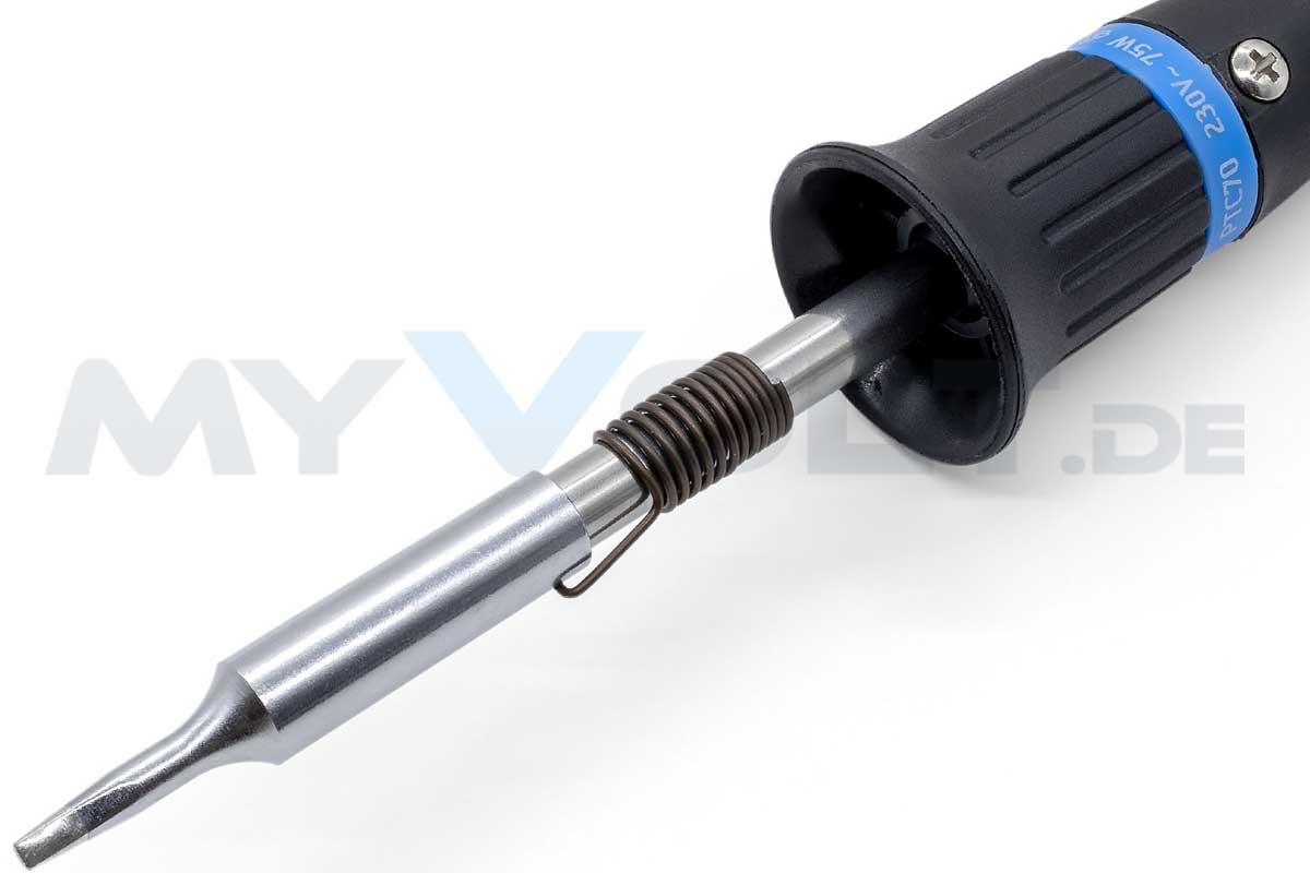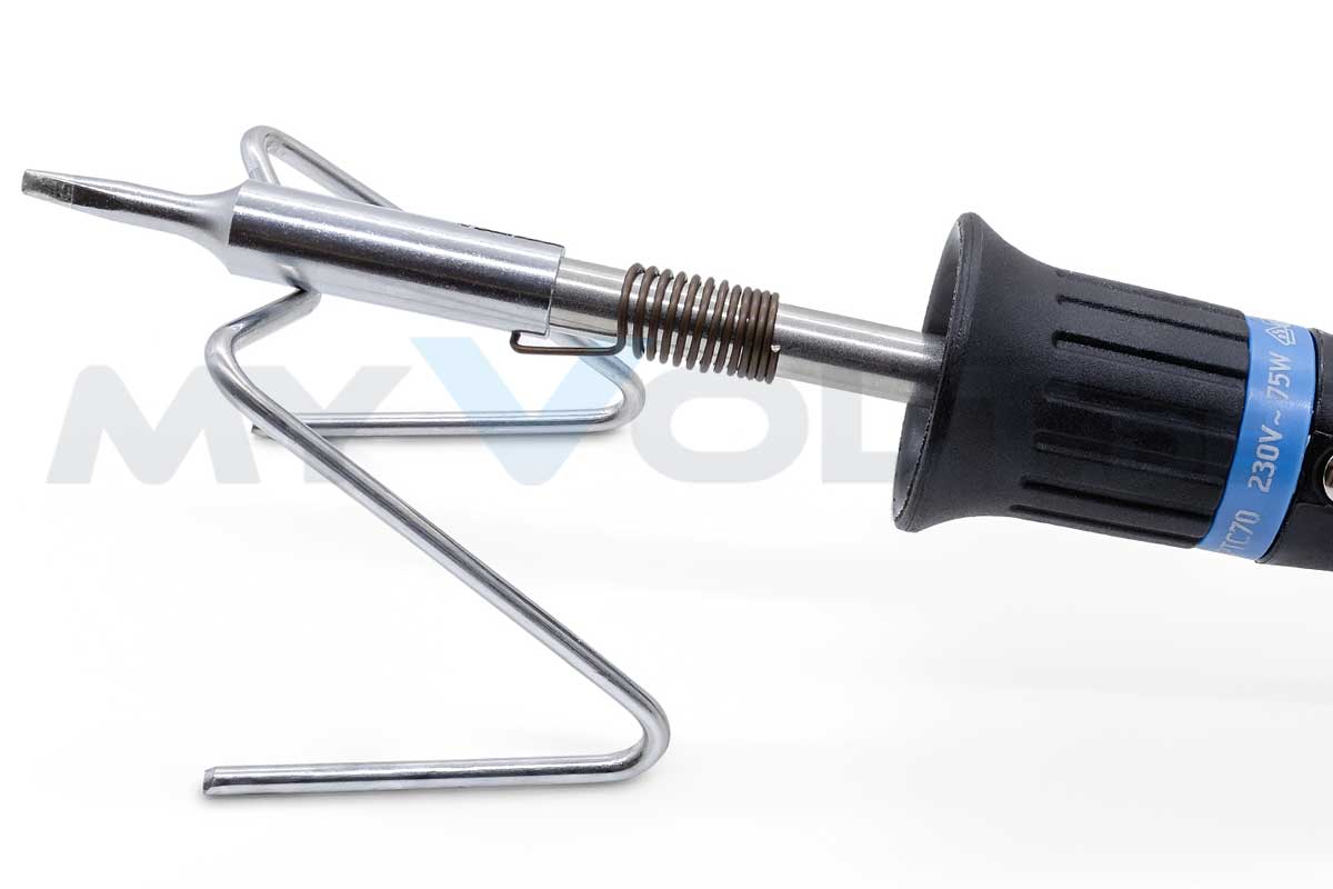 Speziell bei der Verwendung von bleifreien Loten kann es zu einer verstärkten Oxidbildung auf der Oberfläche der Lötspitze kommen. Diese Oxide müssen gezielt entfernt werden, da sie sehr schnell zu einer schwarzen unbenetzbaren Trennschicht führen. Für die Reinigung der Lötspitze kommt eine spezielle Spiralwolle (85% Bronze und 15% Stahl) zum Einsatz. Die Reinigung erfolgt durch Abstreifen oder Drehen der Lötspitze in der Spiralwolle. Nach der Feinreinigung ist weiterhin eine dünne Restlotschicht vorhanden, welche eine sofortige Oxidation der Lötspitze verhindert. Zum besseren Halt ist der Tischständer mit einem Gummisockel versehen.