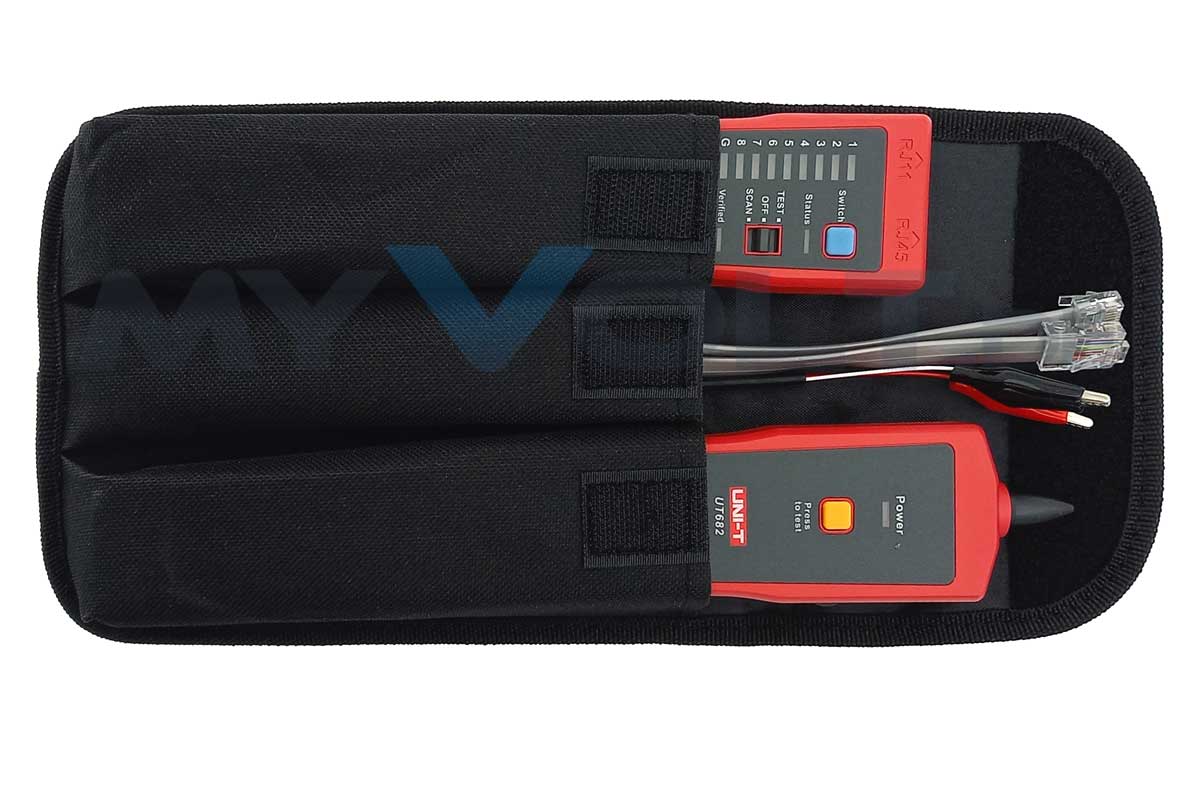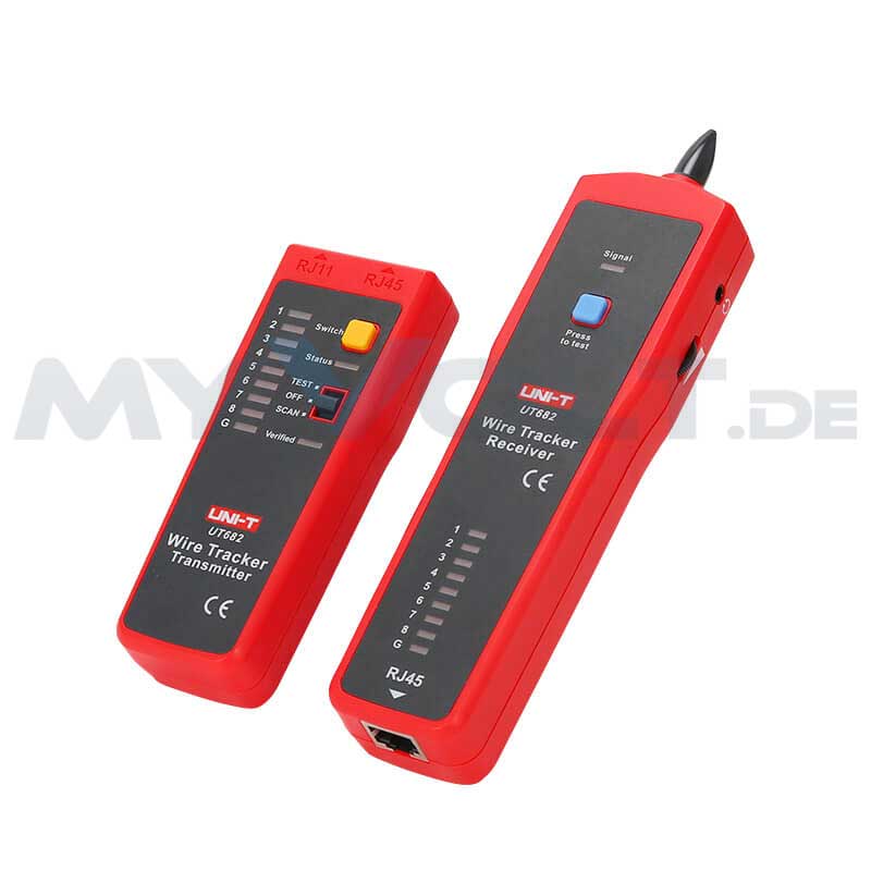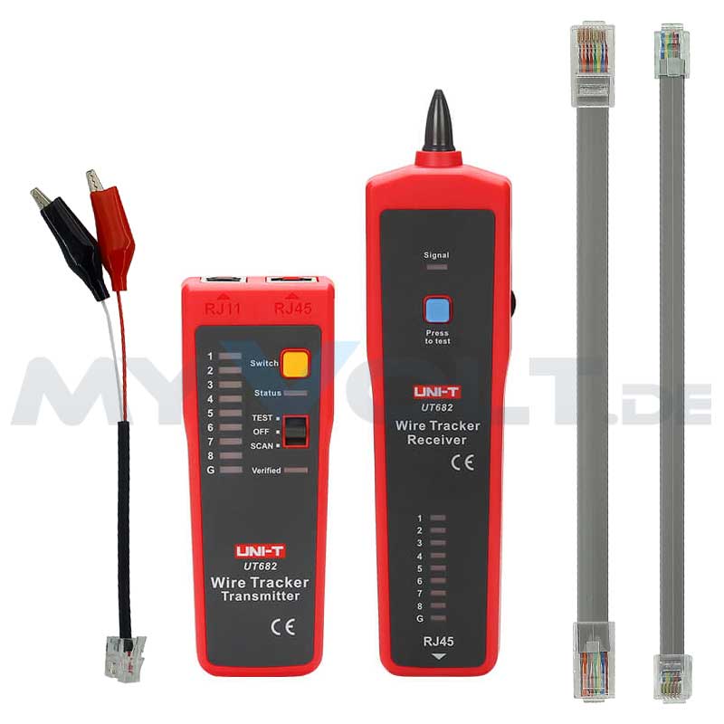 Der Leitungssucher UT682 ist ein professionelles Suchgerät zur kontaktlosen Verfolgung und Identifikation von Leitungen und Kabeln sowie zum Testen von analogen Telefonleitungen. Das zweiteilige Leitungssuchgerät besteht aus einem Sender (Tongenerator), welcher ein Signal auf die zu testende Leitung moduliert und einem hochempfindlichen induktiven Empfänger. Die Empfindlichkeit ist einstellbar, so dass eine sehr exakte Identifikation und Verfolgung selbst in Leitungsbündeln möglich ist. Mit dem UNI-T UT682 können Kabel auch dann noch zuverlässig aufgespürt werden, wenn diese unter der Wand verlaufen. Die Signalisierung erfolgt über einen integrierten Lautsprecher, der den eingespeisten Signalton wiedergibt. Der Sender kann weiterhin als Durchgangstester verwendet werden.