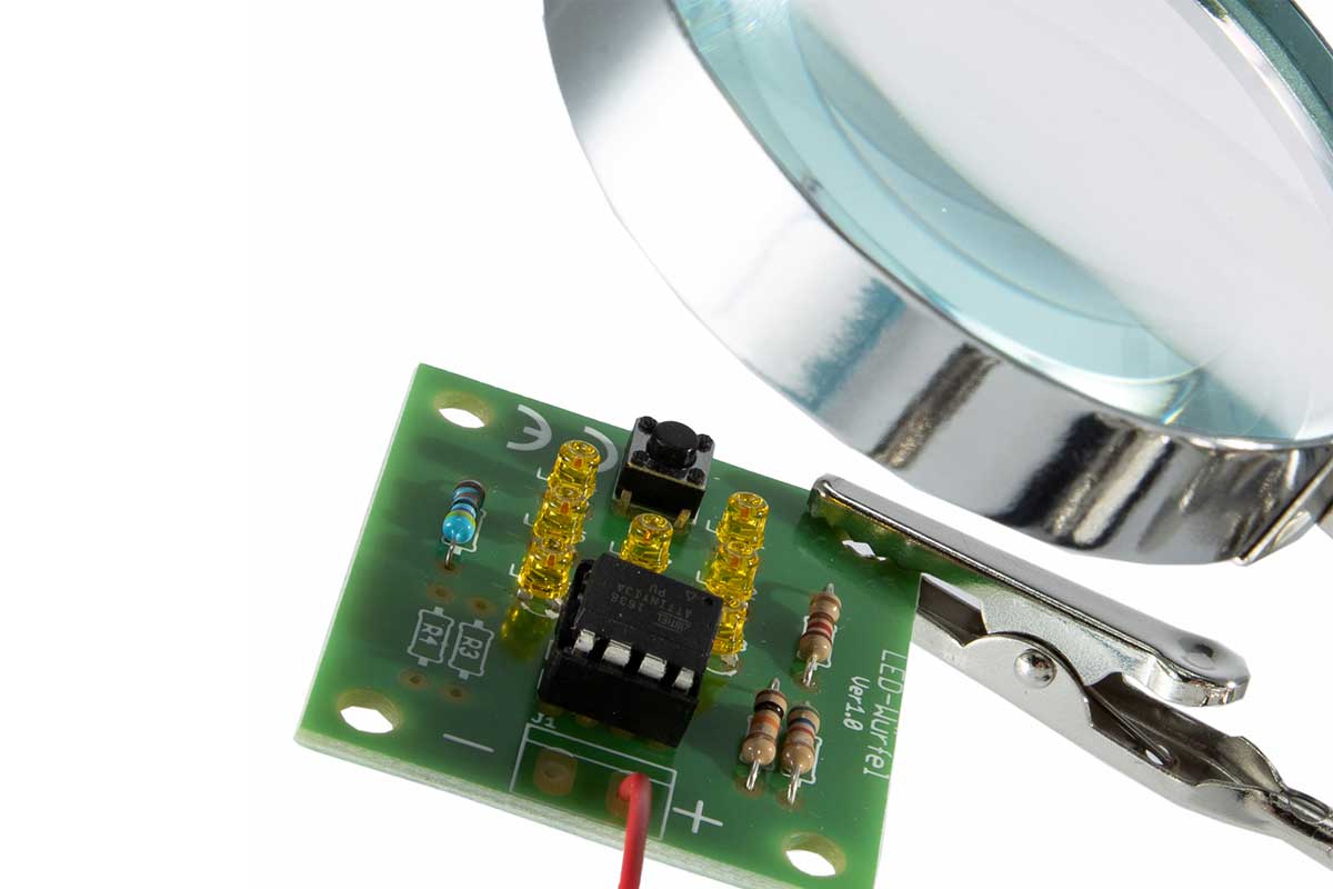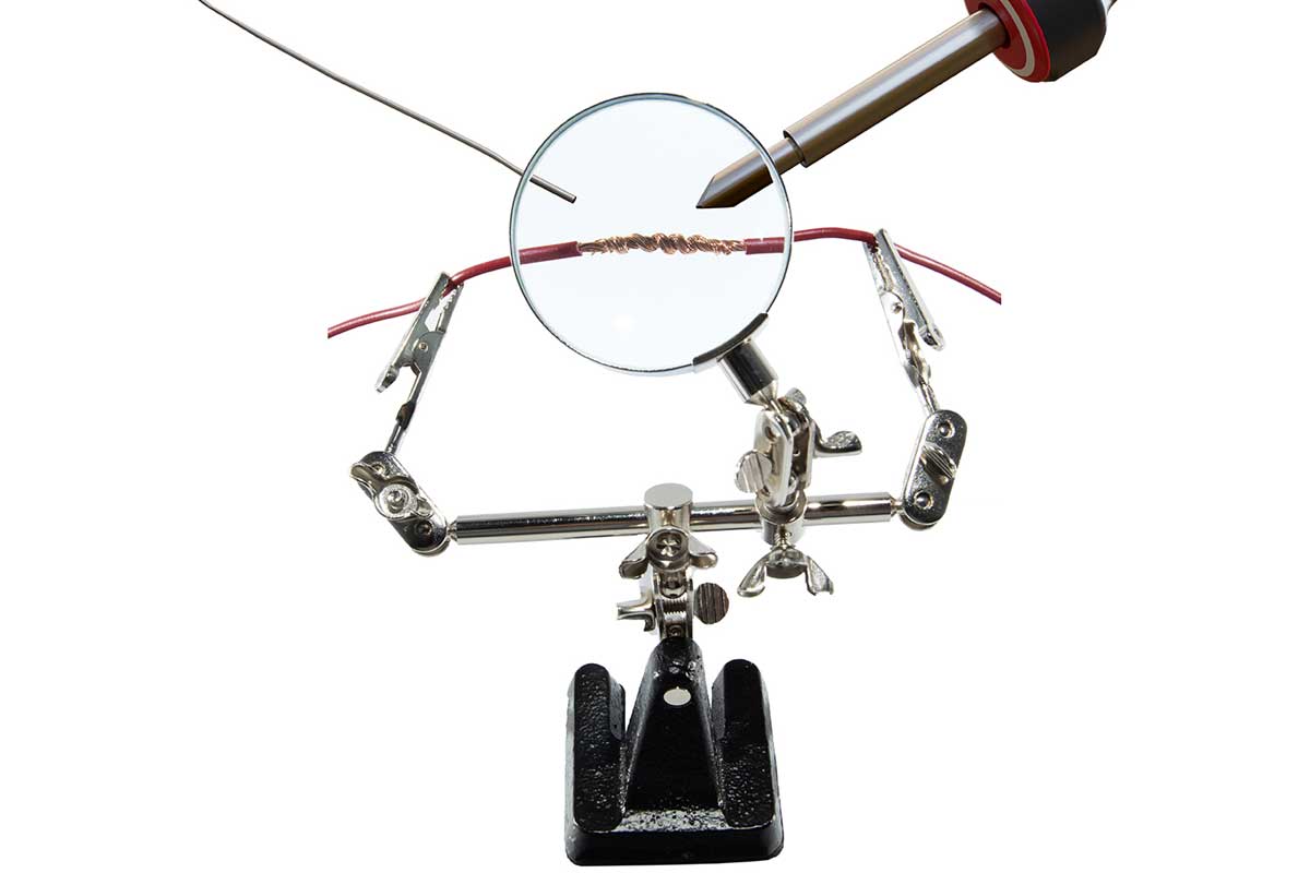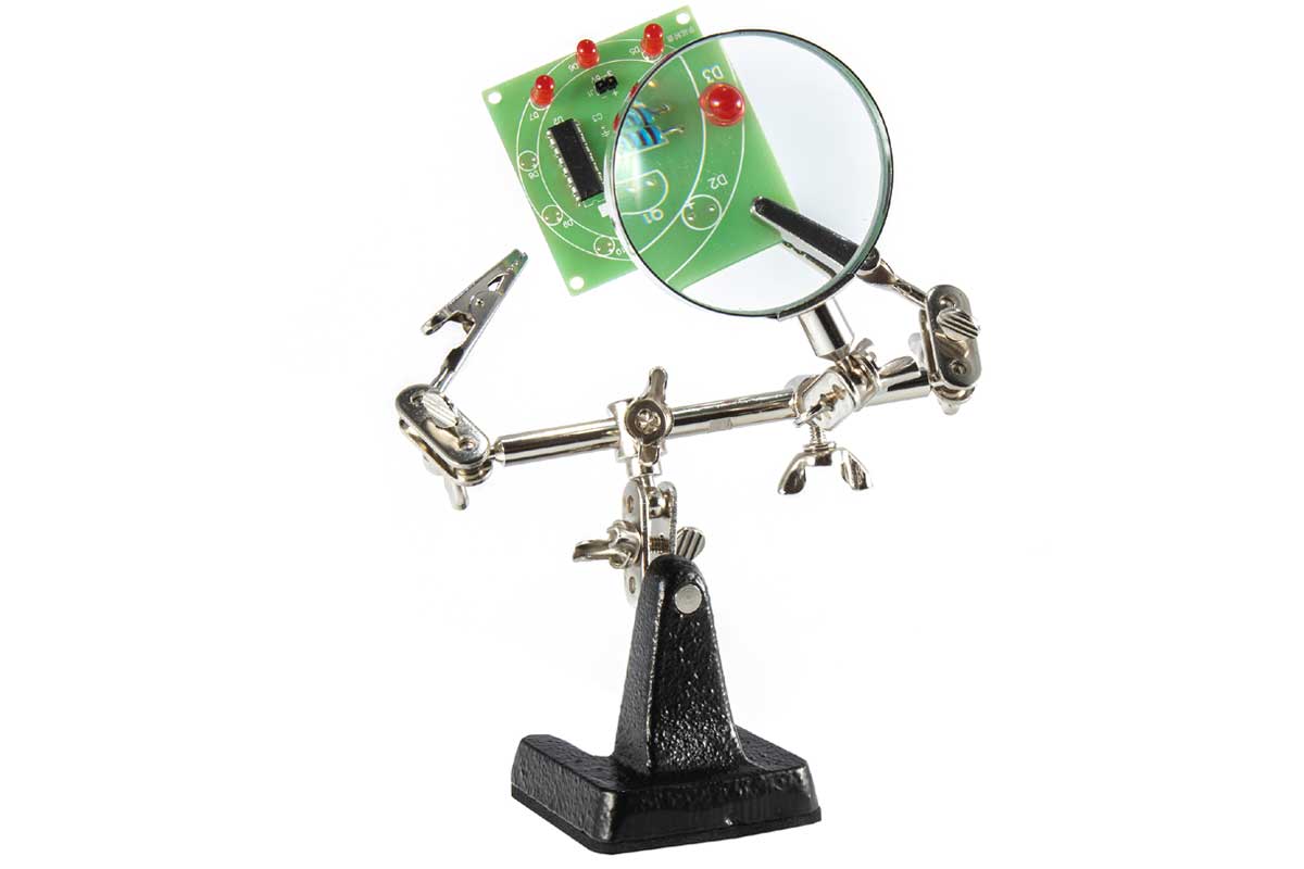 Lässt den Händen freien Spielraum und gewährt bessere Sicht dank der Lupe für verbesserte Lötpräzision und Flexibilität. Bauteile können einfach mit den 2 schwenkbaren Krokodilklemmen fixiert werden und vergrößern den Arbeitsbereich.