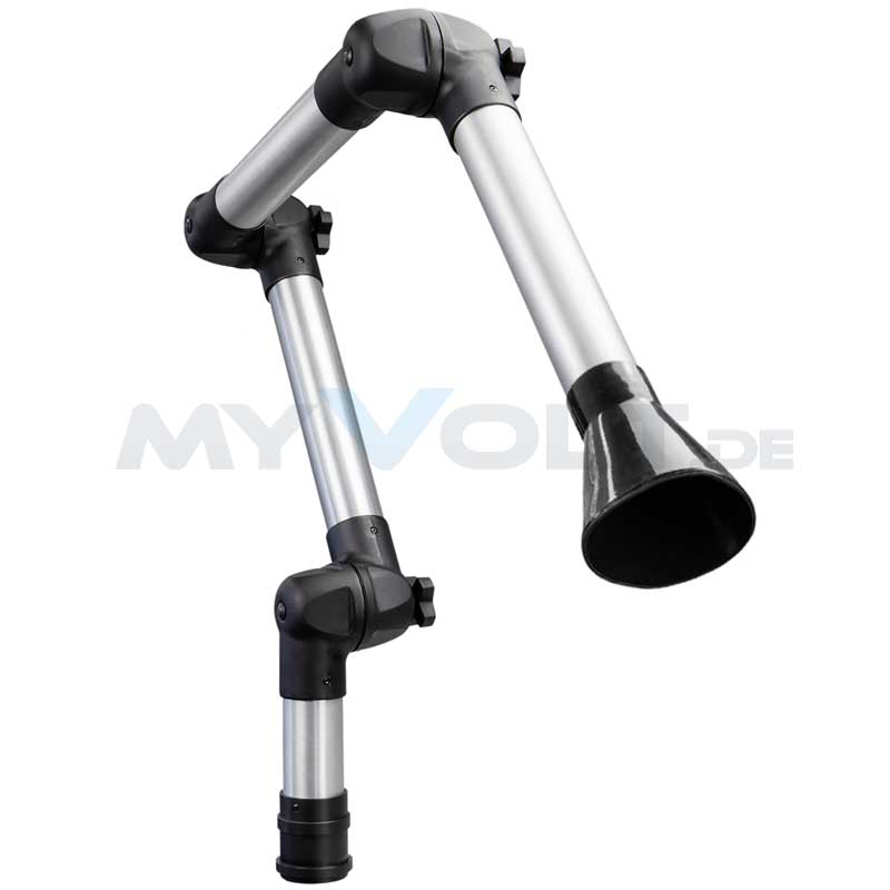 Er lässt sich, auf der zur Montage erforderlichen Tischklemme oder Tischdurchführung (nicht im Lieferumfang enthalten), frei um 360° drehen. Die drei Gelenke können im gewünschten Winkel eingestellt und fixiert werden. So lässt sich der Absaugarm individuell auf jeden Arbeitsplatz einstellen. Der in den einzelnen Gliedern verbaute Federmechanismus ermöglicht ein Kurzzeitiges heranziehen des Absaugarmes. Wird dieser dann wieder freigegeben, schnellt er in seine Ausgangsstellung zurück.