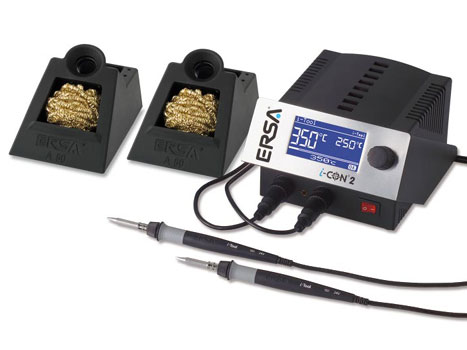ERSA hat mit der i-CON2V eine Kombilötstation entwickelt, die den Anforderungen an die höheren Arbeitstemperaturen und die zunehmend kleineren Prozessfenster der bleifreien Lötvorgänge gerecht wird. Ein großes Multifunktionsdisplay und die bedienerfreundliche Stations-Software mit One-Touch-Bedienung und Online-Hilfe bilden eine innovative Lösung für intelligentes Handlöten. Der Prozessfensteralarm der i-CON informiert den Bediener optisch und akustisch, falls die Temperatur das vorgewählte Temperatur-Prozessfenster verlässt. Die i-CON-Serie ist natürlich antistatisch. Lötkolben i-Tool: