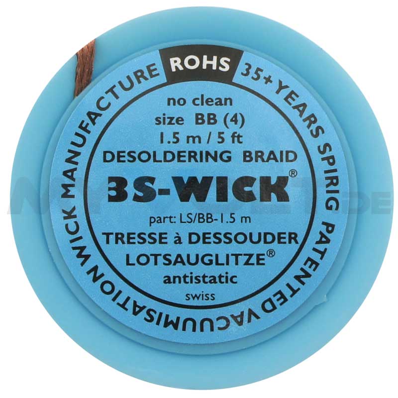 zur sauberen und schonenden Aufnahme von Lötzinn bei Entlötarbeiten. Diese Entlöt-Litze zeichnet sich durch eine hohe Saugkraft aus und ist mit NO-Clean Flussmittel getränkt. Die Entlöt-Litze ist in folgenden Breiten erhältlich und wird in einer praktischen Spenderbox geliefert.L05 0,5mm breit (SMD) orange ESD 0,8mm breit (SMD) Antistatikspule weißL10 1,0mm breit (extra-fein) gelb L15 1,5mm breit (fein) grün ESD 1,5mm breit (fein) Antistatikspule gelbL20 2,0mm breit (mittel) rot ESD 2,2mm breit (mittel) Antistatikspule grünL25 2,5mm breit (grob) blauESD 2,7mm breit (grob) Antistatikspule blau