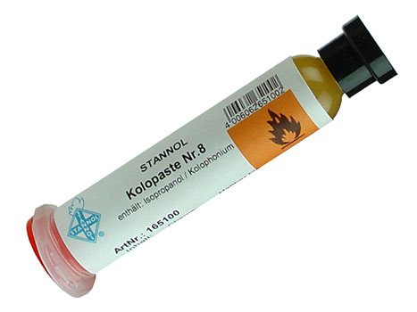 Die Stannol Kolopaste Nr.8 ist ein gebrauchsfertiges gelartiges Kolophoniumflussmittel. Stannol Kolopaste Nr.8 wurde speziell für den Aufbau und die Reparatur von SMD-Schaltungen entwickelt, wobei die Anwendung für alle anderen Handlötapplikationen gleichfalls zu empfehlen ist. Sehr gutes Isolationsverhalten der Flussmittelrückstände.