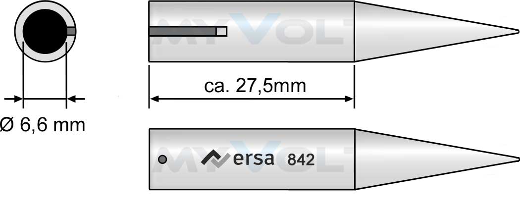 Die 842er Lötspitzen werden von innen beheizt. Ein Führungsschlitz auf der Längsseite dient als Aufsteckhilfe und Verdrehschutz. In das gegenüberliegende Loch wird die Haltefeder eingehängt. Lötspitzen der Serie 842 gibt es in der Standard oder in der LF-Ausführung. Die Variante LF ( LF steht für Leed Free (Bleifrei) ) wird für die Verwendung von bleifreien Loten empfohlen.