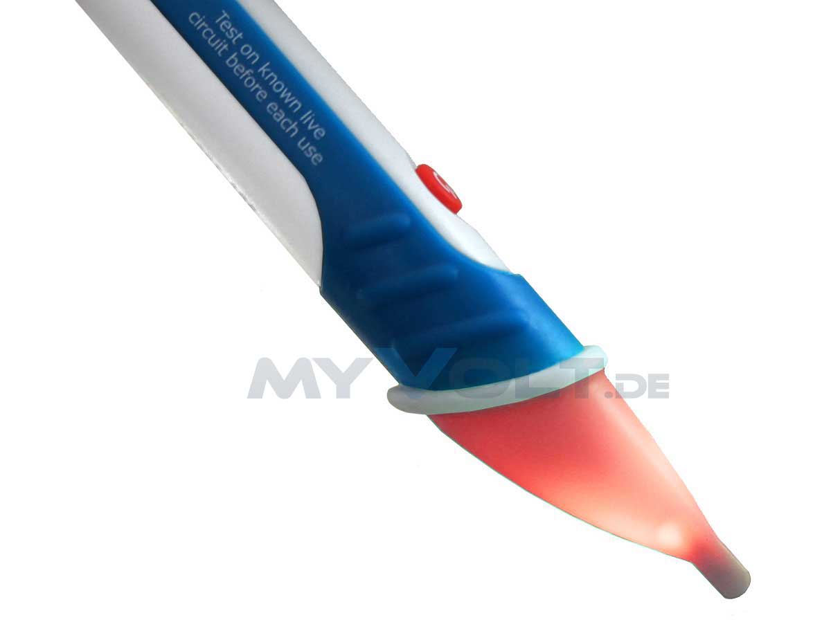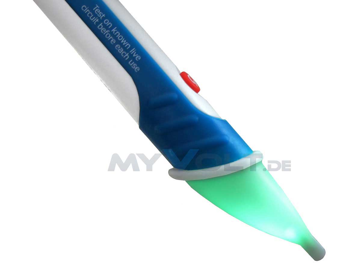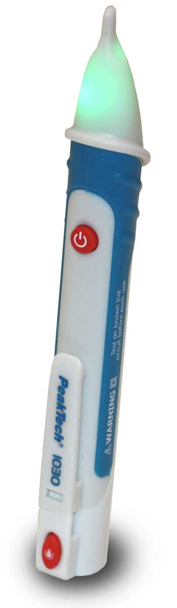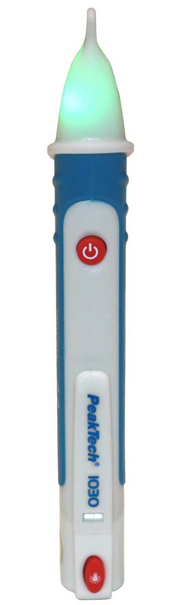 Dieser Spannungsprüfer PeakTech P-1030 eignet sich hervorragend zur berührungslosen Erkennung von Wechselspannungen zwischen 90 V und 1000 V AC. Halten Sie die Spitze einfach in eine Steckdose, Lampenfassung oder an ein isoliertes Kabel. Mit dem PeakTech P-1030 können auch unter Putz verlegte Kabel erkannt und Leitungsunterbrechungen lokalisiert werden. Liegt an dem betreffenden Messpunkt Wechselspannung an, wird diese visuell über eine rot blinkende LED (in der Prüfspitze) angezeigt und der integrierte Summer ertönt. Ist der Messpunkt spannungsfrei, so leuchtet die Prüfspitze dauerhaft grün.